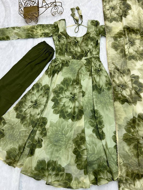 ✨ Add the Mehandi Organza Printed Anarkali Gown With Pant & Dupatta Set to your festive collection today! (Insert product/store link here)